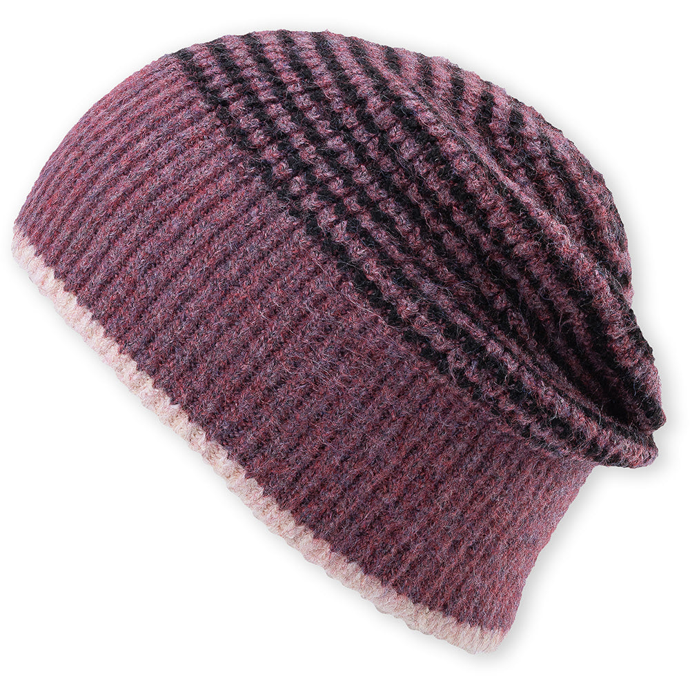 Slouch beanie, striped patterning, metal badge detailing.