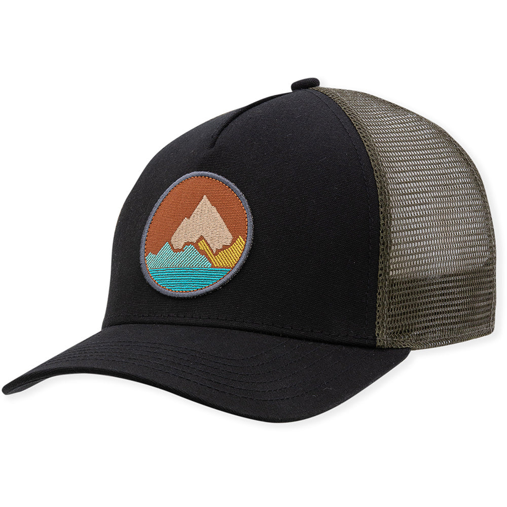 Mid-crown trucker, embroidered patch with mountains on front panel.